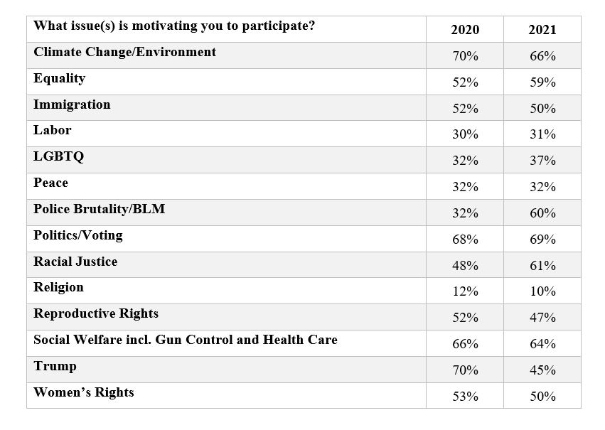 The 2021 Indivisible Census, which closed earlier this month, provides more evidence about the ways that White Allies have joined the call to end systemic racism in America (note that the Indivisible network is made up predominantly of highly educated, middle aged White women). When asked what issues are motivating their political work, we see a clear shift in priorities for Indivisibles: many more are motivated by issues of Police Brutality and Racial Justice and fewer are motivated by Trump (who is no longer president).