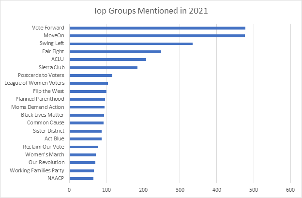 Respondents wrote in about 2,000 groups that they had worked with around the 2020 elections. Five groups were each named by more than 200 respondents individually: Vote Forward, MoveOn, Swing Left, Fair Fight, and ACLU. It’s worth noting that there was quite a bit of overlap with the organizations mentioned in 2020; 12 of the top 15 groups were in the top-15 during both years. The three groups that were new were: Fair Fight, Flip the West, and Black Lives Matter. For those respondents who reported participating with other groups as well as Indivisible, more than half of them (56%) reported that Indivisible was their “primary connection to the progressive movement.” The following figure shows the groups that were mentioned by at least 60 individual respondents in 2021.