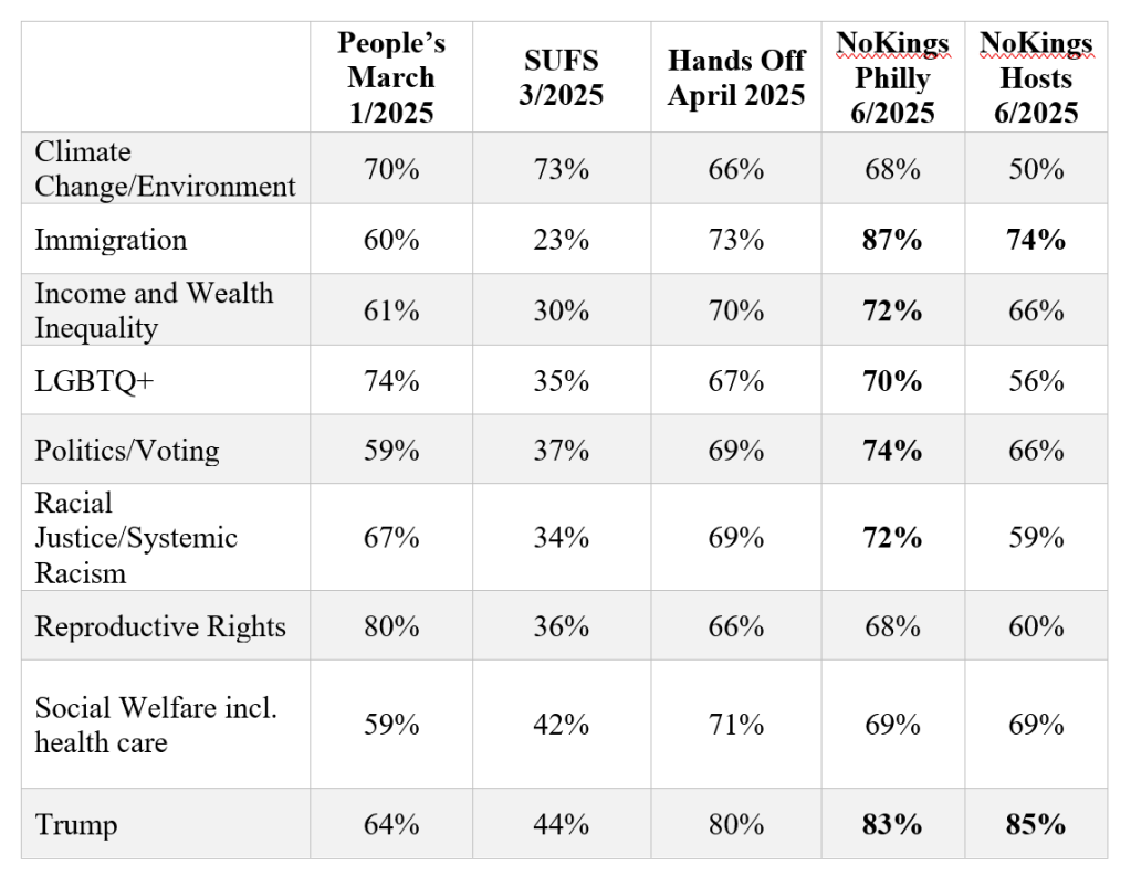 Top motivations for participation for hosts of NoKings events (over 70%) was: Trump and Immigration. For participants at the flagship event in Philadelphia, it was: Immigration, Trump, Politics/Voting, Racial Justice, Income and Wealth Inequality, and LGBTQ+ issues.