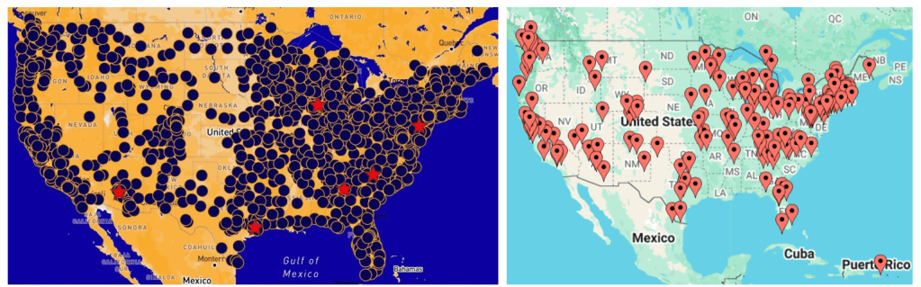 My team surveyed participants at the flagship event in Philadelphia and hosts organizing events across the US. Here’s a map of the events across the US (left) and the hosts who participated in the study (right), which represent over 10% of all hosts for the events: