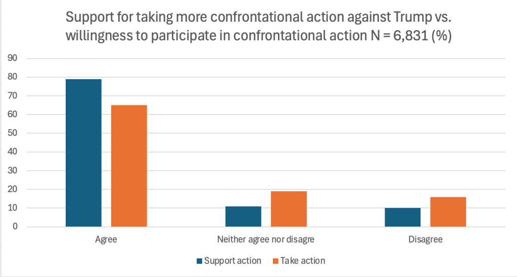 This weekend, I published a piece in The Guardian that discusses how activists participating in the Resistance to the second Trump Administration are getting more confrontational. In it, I discuss data collected from participants in the Free America Walkout on January 20th that shows how Resisters (yes, most participants in the walkout continued the trend we have seen throughout the Resistance of being predominantly highly educated, White women who are older) have become much more open to disruptive and confrontational tactics.