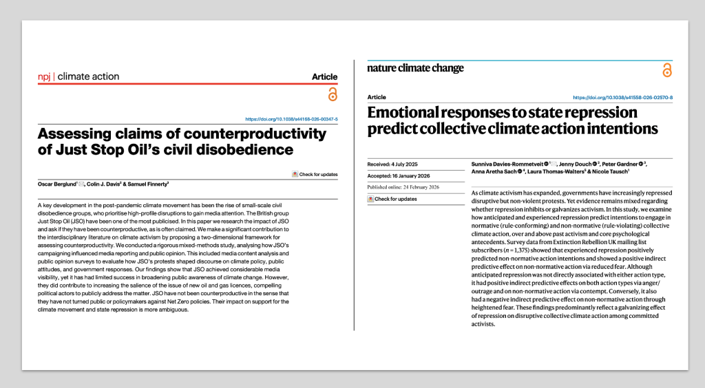 Second, a different team of scholars (two of whom I’ve published with in Nature), do a deep-dive into the effectiveness of civil disobedience. The authors integrate data from a range of sources to conduct their research, looking at media coverage, public opinion, and data on actual oil and gas licenses to understand the impact of the group Just Stop Oil and their civil disobedience in the UK. This type of a mixed methodological approach, looking specifically at the relationship among media attention, public opinion, and policymaking is great to see! Too often, scholars use online simulations that they then assume to be generalizable to the real world (which it frequently is NOT). The authors conclude that the organization’s acts of civil disobedience “succeeded in getting media attention, contributed to raising the salience of oil and gas licences in the North Sea, and politicising the issue.” The effects of these acts of civil disobedience did not have an effect on public opinion about climate change or oil and gas licenses–ie they were neither effective nor counterproductive. Read the whole paper here.